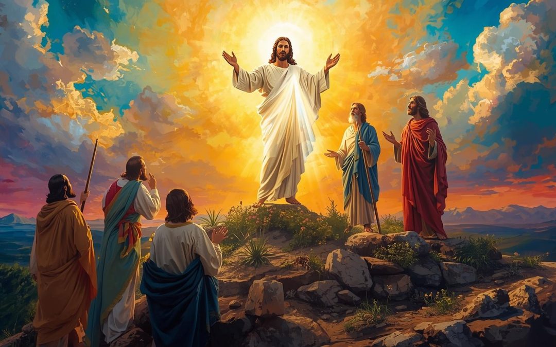 Obraz do modlitwy: wzrokiem wyobraźni spróbujmy zobaczyć Jezusa, podczas Jego przemienienia na górze Tabor, kiedy to Jego twarz zajaśniała jak słońce, a Jego odzienie stało się białe, jak światło, byśmy byli tam z Apostołami, z Mojżeszem